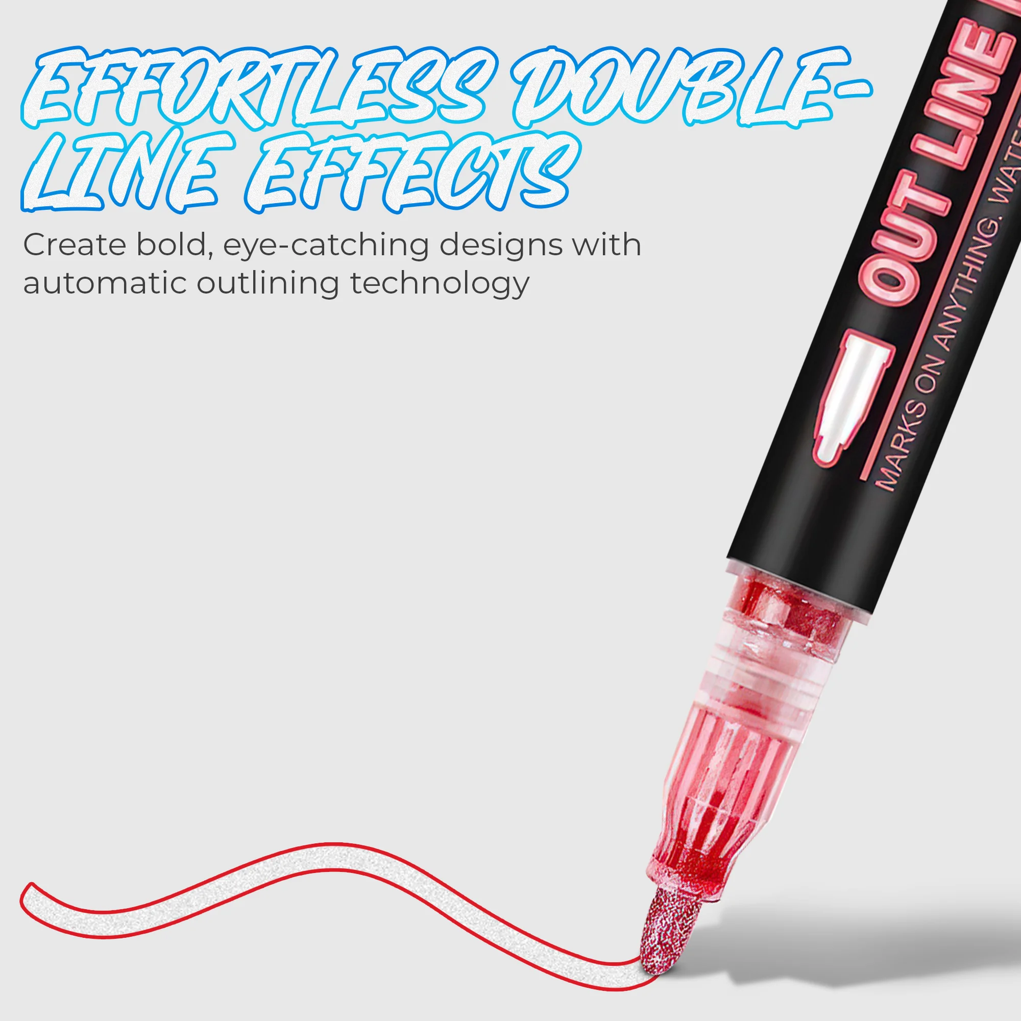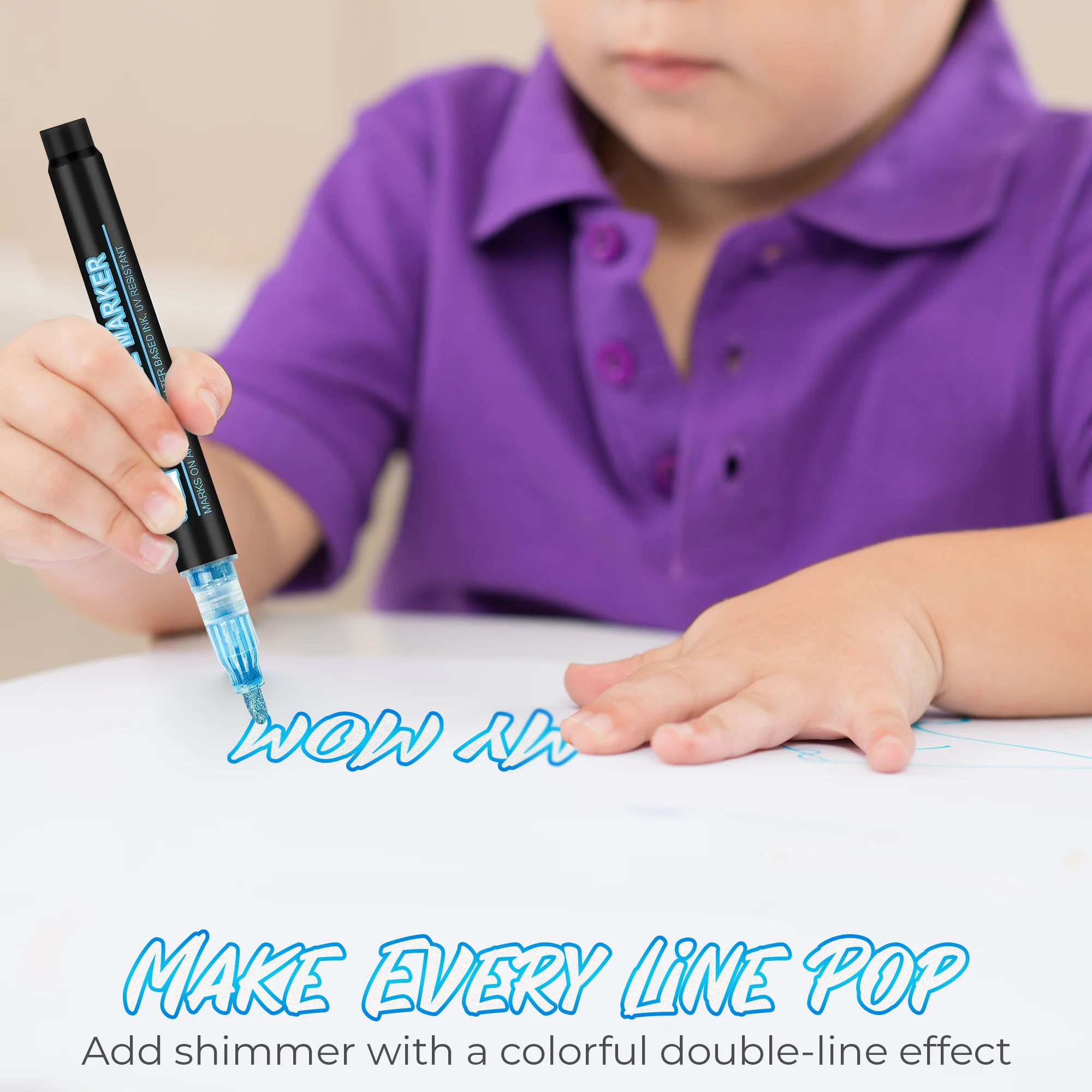 • DOUBLE-LINE EFFECT — Create unique, eye-catching artwork with shimmering silver ink surrounded by a colorful border, thanks to automatic outlining technology of these dazzle markers. Each stroke is a masterpiece, capturing attention with vivid shimmer markers double lines. Elevate your designs effortlessly with distinctive outlines that highlight each color of your new cool markers